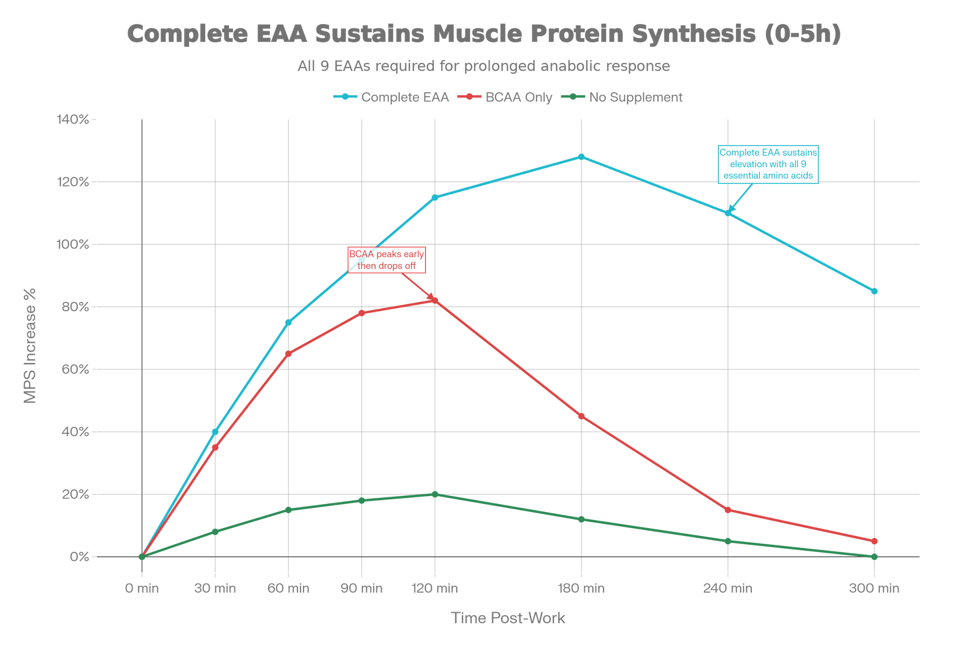 Complete EAA supplementation (all 9 amino acids) can be taken at any time, with post-workout timing delivering the highest response rate.